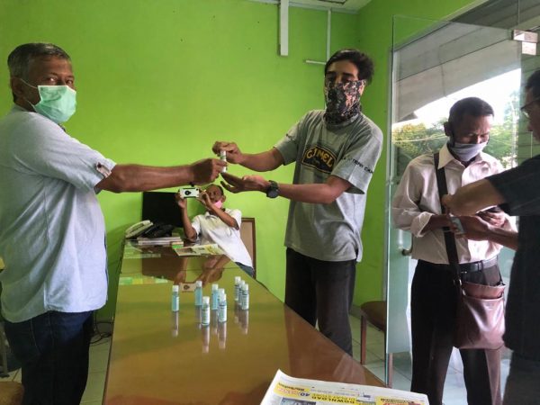 Sekretaris PWI Tanjungpinang-Bintan saat membagikan hand sanitizer ke wartawan di Kantor Tanjungpinang Pos