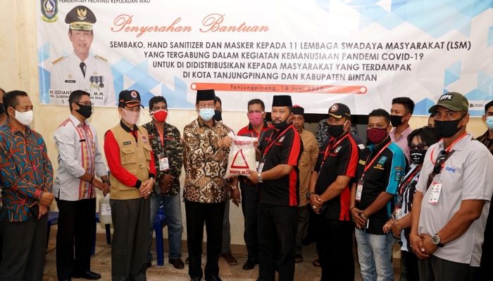 Advetorial, (MetroKepri) – Plt Gubernur Kepri H. Isdianto yang juga Ketua Tim Gugus Tugas Covid-19 Kepri menyerahkan bantuan Sembako, hand sanitizer dan masker kepada 11 Lembaga Swadaya Masyarakat (LSM) yang tergabung dalam kegiatan kemanusiaan Pandemi Covid-19.