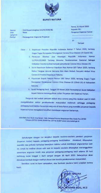 Dalam surat bernomor 501/Disperindagkop.umk/III/2020/116 tertanggal 31 Maret 2020, Bupati Natuna menghimbau kepada pengurus Koperasi Harian untuk turut prihatin dengan kondisi terkini dan berharap agar untuk angsuran kredit pinjaman dapat ditangguhkan selama 30 hari kedepan yakni dari tanggal 1 sampai 30 April 2020.