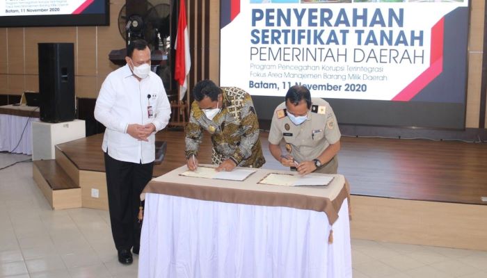Advetorial, (MetroKepri) – Pejabat sementara (Pjs) Wali Kota Batam Syamsul Bahrum menerima sertifikat tanah milik Pemerintah Kota (Pemko) Batam dari Badan Pertanahan Nasional (BPN) pada acara penyerahan sertifikat tanah pemerintah daerah se-Kepri program pencegahan korupsi terintegrasi fokus area manajemen barang milik daerah di Lantai IV Kantor Wali Kota Batam, Rabu (11/11/2020).
