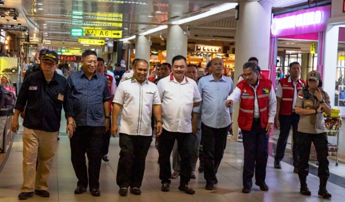 Sambil meninjau, rombongan terlihat berdiskusi dan berdialog dengan Direktur Badan Usaha Bandar Udara Suwarso secara langsung.