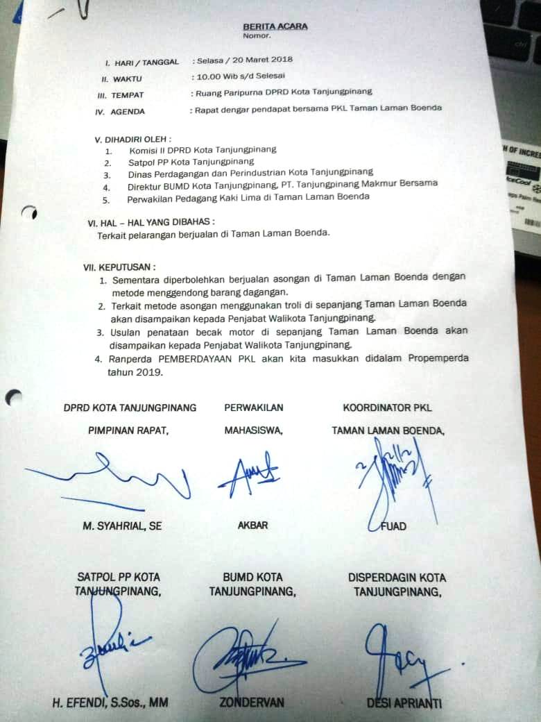 “Ini ada berita acara rapatnya. Dan kita belum dapat data, apakah pedagang sekarang masih orang orang yang lama atau ada yang baru. Kalau ada yang baru, tentu mereka tidak tahu ada kesekapatan tersebut,” ujar Hendy yang juga Ketua Bapemperda DPRD Kota Tanjungpinang ini.