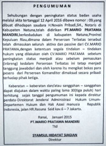Pengumuman Atas Kepemilikan Perusahaan19/04/201620/04/2016by -261 viewsby Baca Juga : Asep Akan Gali Potensi Usaha Melalui BUMDJangan LewatkanLantik Seluruh Ormawa UMRAH 2026, Wakil Rektor Dorong Kegiatan Bertaraf InternasionalUKM Risalah Maritim UMRAH Resmi Punya Nahkoda Baru Periode 2025–2026Pematangan Lahan Diduga Picu Banjir, 11 Rumah Warga Indonusa Lestari TerendamBatam Innovation Award 2025: Pemko Batam Apresiasi Pelaku Inovasi, Bapenda Raih OPD TerinovatifAtasi Penumpukan Sampah, Li Claudia Tinjau Lokasi TPS Baru di Batam