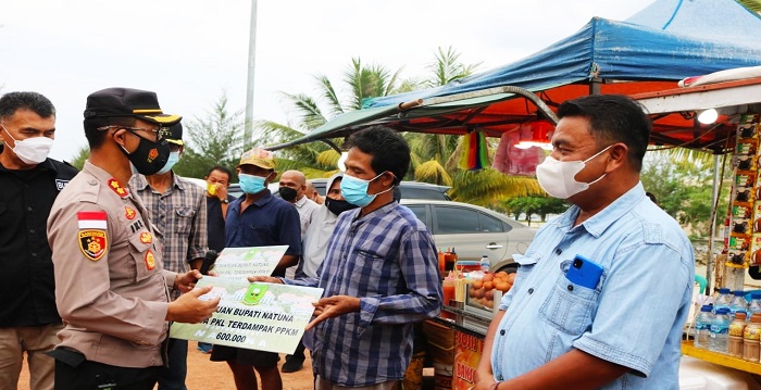 Natuna, (MetroKepri) – Bupati Natuna Wan Siswandi S.Sos,M.Si menyerahkan bantuan sebesar Rp600 ribu kepada sejumlah pedagang kaki lima Pantai Piwang di masa PPKM Mikro, Minggu (18/07/2021) sore.