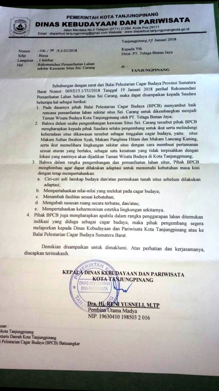 Berikut kutipan surat rekomendasi dari Dinas Kebudayaan dan Pariwisata Kota Tanjungpinang;