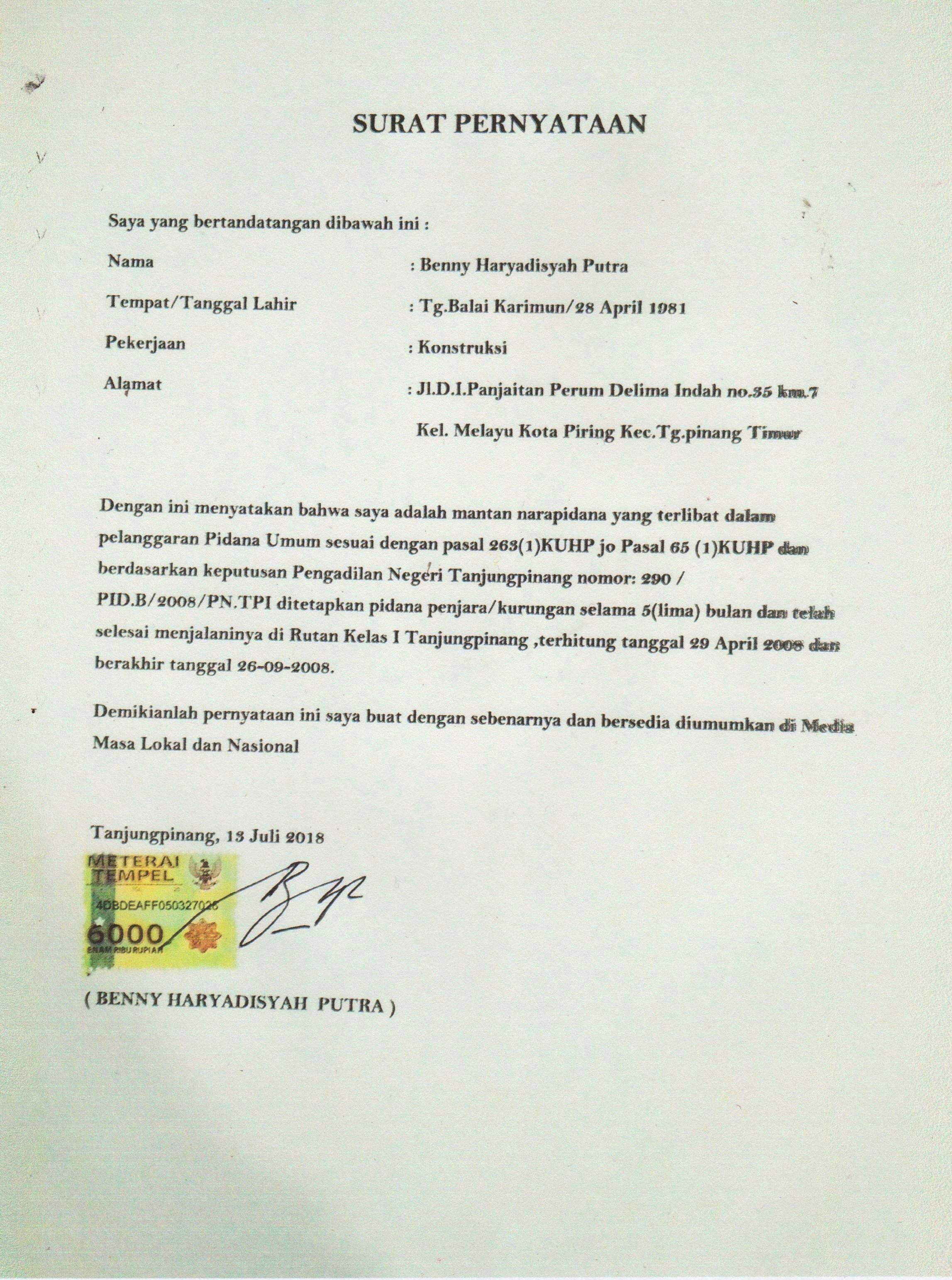 Surat Pernyataan Benny Haryadisyah Putra15/07/201815/07/2018by ALPIAN TANJUNG-608 viewsby ALPIAN TANJUNG Surat Pernyataan Baca Juga : KPU RI Ingin Pilkada Tanjungpinang SuksesJangan LewatkanLantik Seluruh Ormawa UMRAH 2026, Wakil Rektor Dorong Kegiatan Bertaraf InternasionalUKM Risalah Maritim UMRAH Resmi Punya Nahkoda Baru Periode 2025–2026Pematangan Lahan Diduga Picu Banjir, 11 Rumah Warga Indonusa Lestari TerendamBatam Innovation Award 2025: Pemko Batam Apresiasi Pelaku Inovasi, Bapenda Raih OPD TerinovatifAtasi Penumpukan Sampah, Li Claudia Tinjau Lokasi TPS Baru di Batam