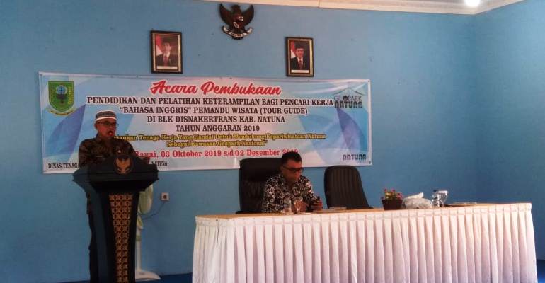 Natuna, (MetroKepri) – Dinas Tenaga Kerja dan Transmigrasi Kabupaten Natuna menggelar Diklat Keterampilan bagi Pencari Kerja Bahasa Inggris/ Pemandu Wisata (Tour Guide) Tahun 2019, di Gedung Aula Balai Latihan Kerja (BLK) Natuna, Kamis 03 Oktober 2019.